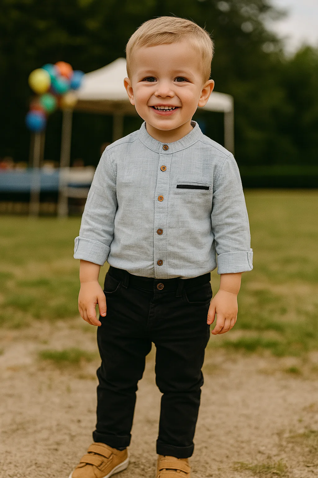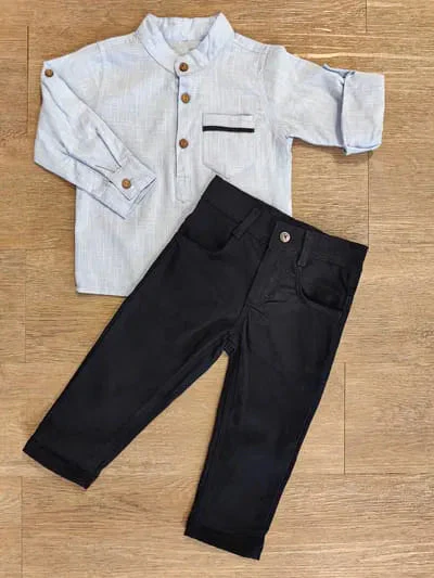 Craquez pour cet ensemble élégant composé d’une chemise col mao à boutons en bois et d’un pantalon bleu marine en toile. Parfait pour les grandes occasions ou un look habillé au quotidien, cet ensemble offre à votre petit garçon confort et raffinement.