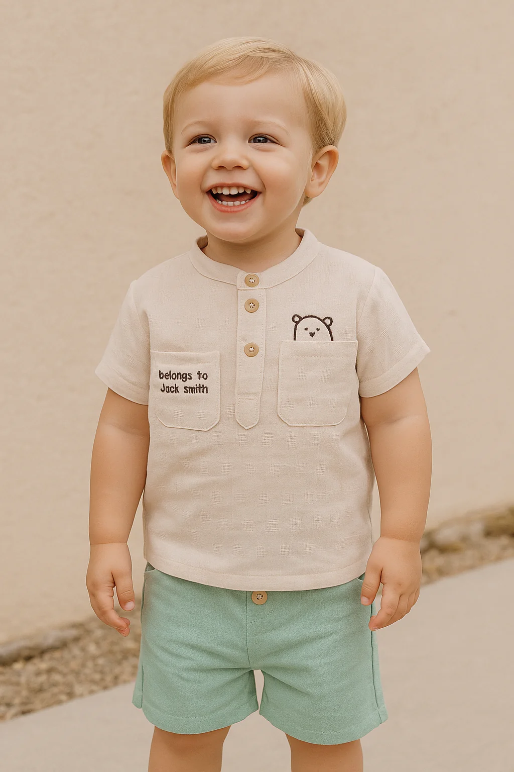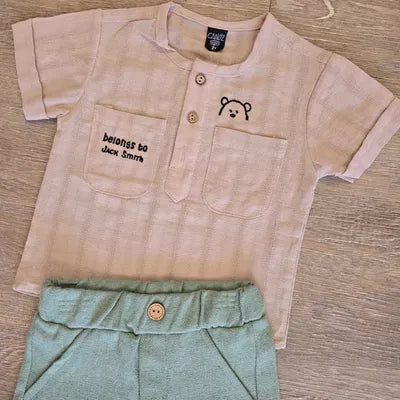Le haut présente deux poches plaquées dont une brodée d’un petit ours discret, ajoutant une touche enfantine et craquante. L’inscription “belongs to Jack Smith” ajoute une touche personnalisée qui rappelle les pièces uniques et authentiques. Le tissu respirant en coton-lin procure un confort optimal même lors des journées les plus chaudes.