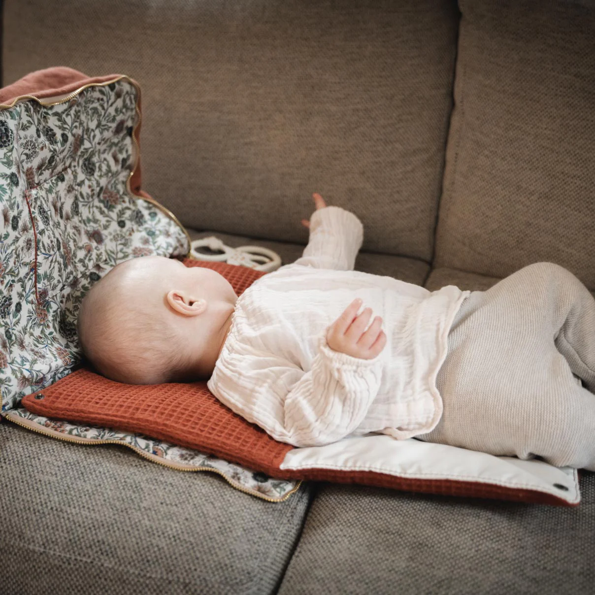 10 – Matelas à langer en mousse (épaisseur 3cm), recouvert de tissu 100% coton en nid d’abeille, et d’une partie en plastique pour nettoyer facilement la partie de change. Matelas détachable, pour le laver en machine et l’enlever quand l’enfant grandit. Couleur du matelas: terracotta pour le sac terracotta, vert kaki pour le sac vert, blanc pour le sac beige.