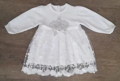 Conçue pour une occasion spéciale (baptême, mariage, anniversaire), elle allie confort et raffinement. Le haut en coton doux est orné d’un motif perlé argenté, et la jupe en dentelle florale délicate ajoute une touche féérique à cette robe bébé 9 mois.