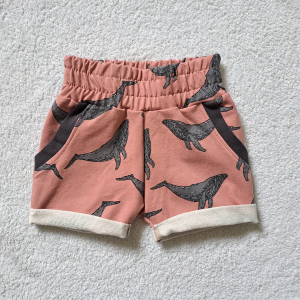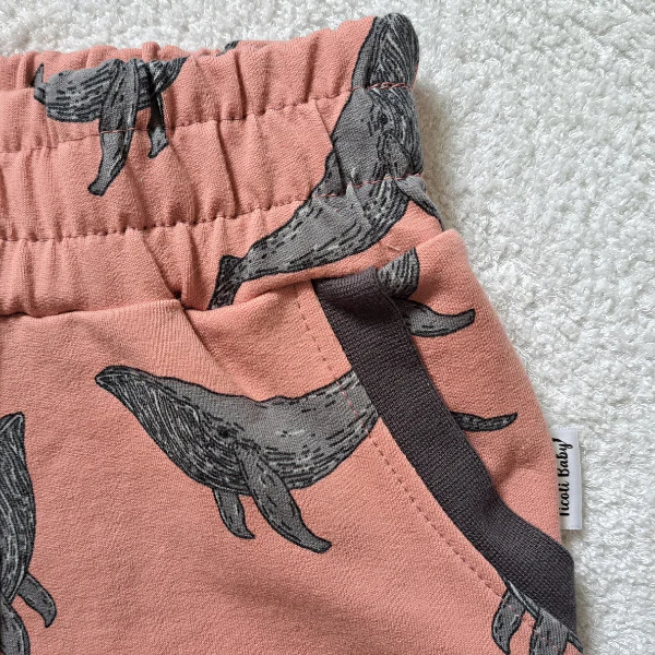 La bande à la taille est élastique, sans trop serrer l’enfant à la taille. Avec un beau motif de baleines, le look est vibrant et se porte été comme automne. On porte ce short avec une camisole, un t-shirt ou un cache-couche.